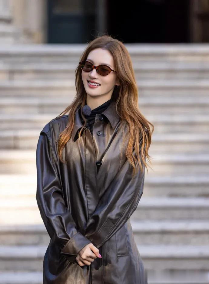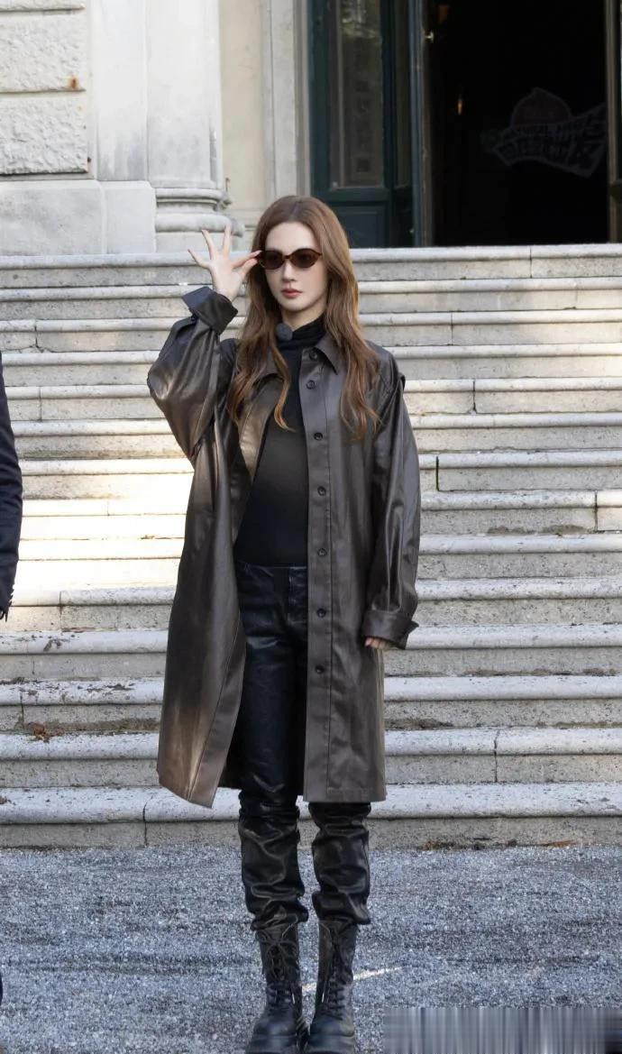 金晨这回风格大变! 长款皮衣+皮裤+长筒靴, 时髦又高级!