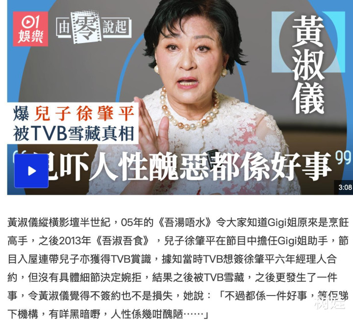 徐肇平婉拒了TVB后,TVB还曾经询问黄淑仪,认为是黄淑仪不让儿子签约,黄淑仪回应称与自己无关,全是儿子自己的决定。结果在这之后徐肇平就被TVB雪藏了,完全不让他有出镜的机会,并且还全面“封杀”,就连同公司的艺人去捧场徐肇平的活动都不允许。黄淑仪觉得TVB太过分,触碰了她的底线,气不打一处来,所以更觉得儿子没有签约TVB是正确的选择。黄淑仪自曝当时还安慰儿子称,没有签约不是坏事,可以看清娱乐圈的现实与丑陋的一面,而在这件事之后徐肇平心灰意冷地返回了加拿大,而黄淑仪也很自责,因为是她让儿子回香港发展的。