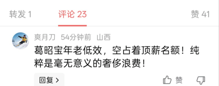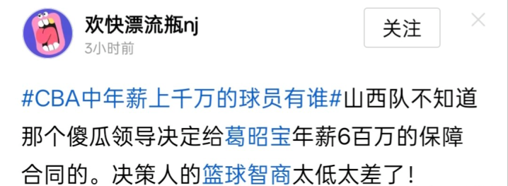 基于对球队所做出的贡献,葛昭宝确实配一份顶薪。但是今年有球迷私下议论,请大宝让出顶薪,省下的钱引进外援或者更有即战能力的年轻球员。还有球迷说,葛昭宝年老低效,空占着顶薪名额!纯粹是毫无意义的奢侈浪费。更有球迷过激地议论到:给葛昭宝600万的保障合同,决策人的篮球智商太低太差了。说实话,可能这位球迷连规则都不懂。顶薪就是对球员的一种保障,哪怕他的状态大不如以前。在对待球员的使用上,山西汾酒男篮在全联盟是最有人情味的,也是最人性化的球队!