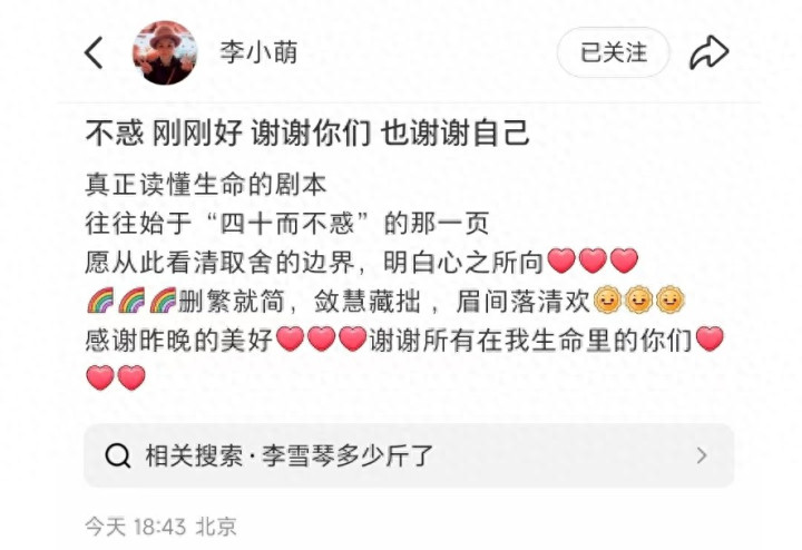9月13日,演员李小萌在个人社交平台分享了一组庆祝40岁生日的美照,她还发文写道:“不惑,刚刚好,谢谢你们,也谢谢自己”。看得出来,对于自己的四十不惑,李小萌并没有一点儿年龄焦虑,心态非常好。她还直言现在已经真正读懂生命的剧本,因为“往往始于‘四十而不惑’的那一页”。李小萌写下了自己的生日心愿,字字句句都能感受到她对当下生活的满足以及幸福。